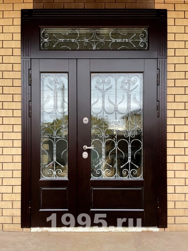 Двустворчатая дверь МДФ с карнизом, с остеклением и коваными решетками